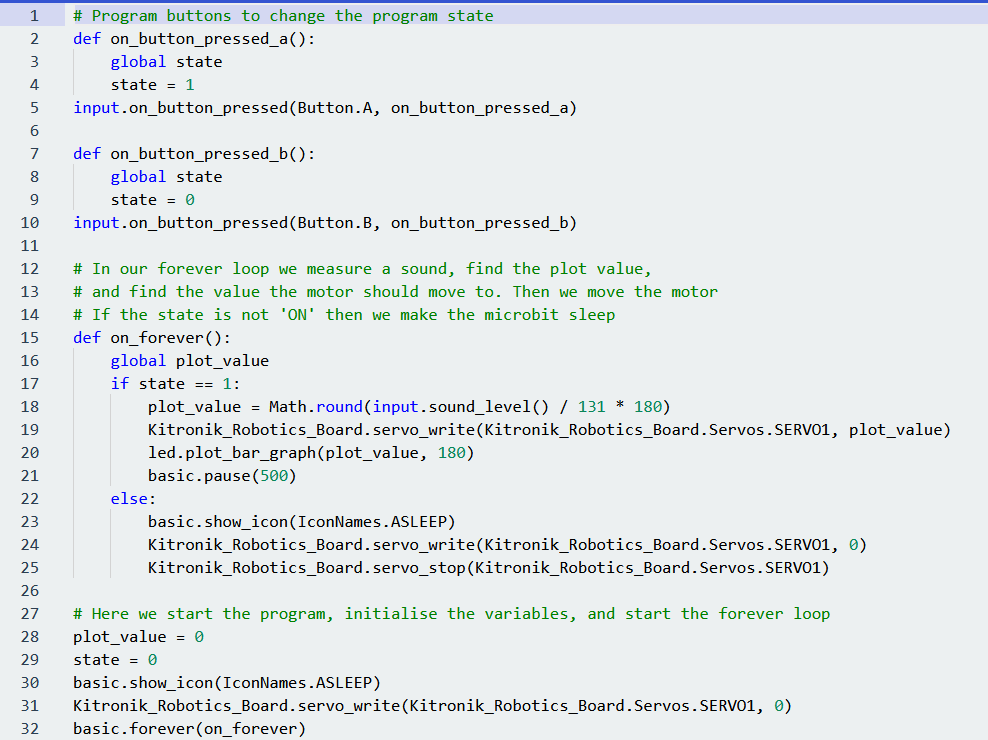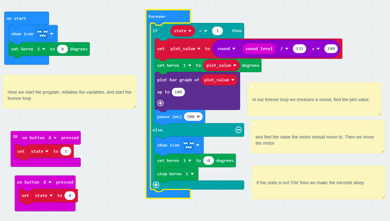 To make the volume meter, we want to measure the sound, then tell the motor to move to a position. The louder the sound the more the motor can move. We can achieve this by dividing the maximum degrees the motor can move by the maximum volume level.